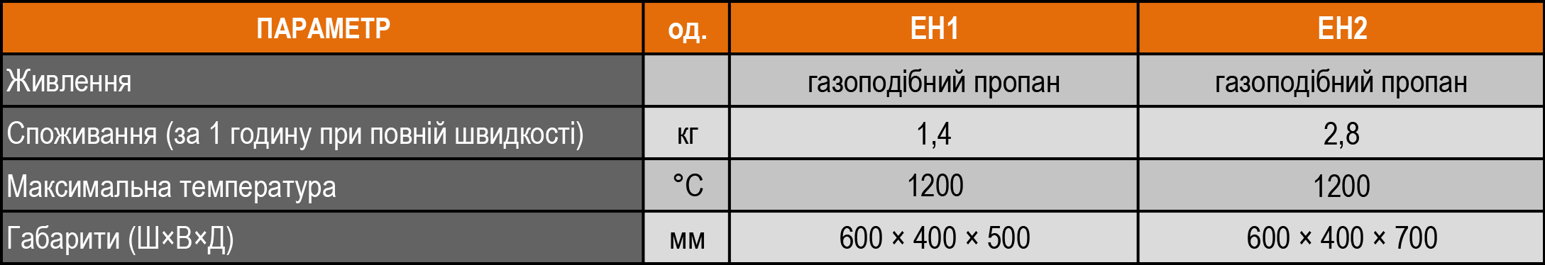 Максимальна температура нагріву 1200° С. Працює від живлення газоподібним пропаном.
